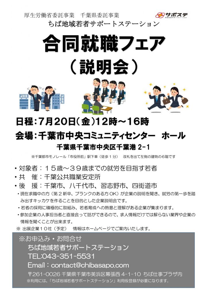 皆さんこんにちは!ちばサポステです。第1回合同就職フェアが7/20(金)に行われます。求職者の皆さんを大募集中です!Let’s 就職!