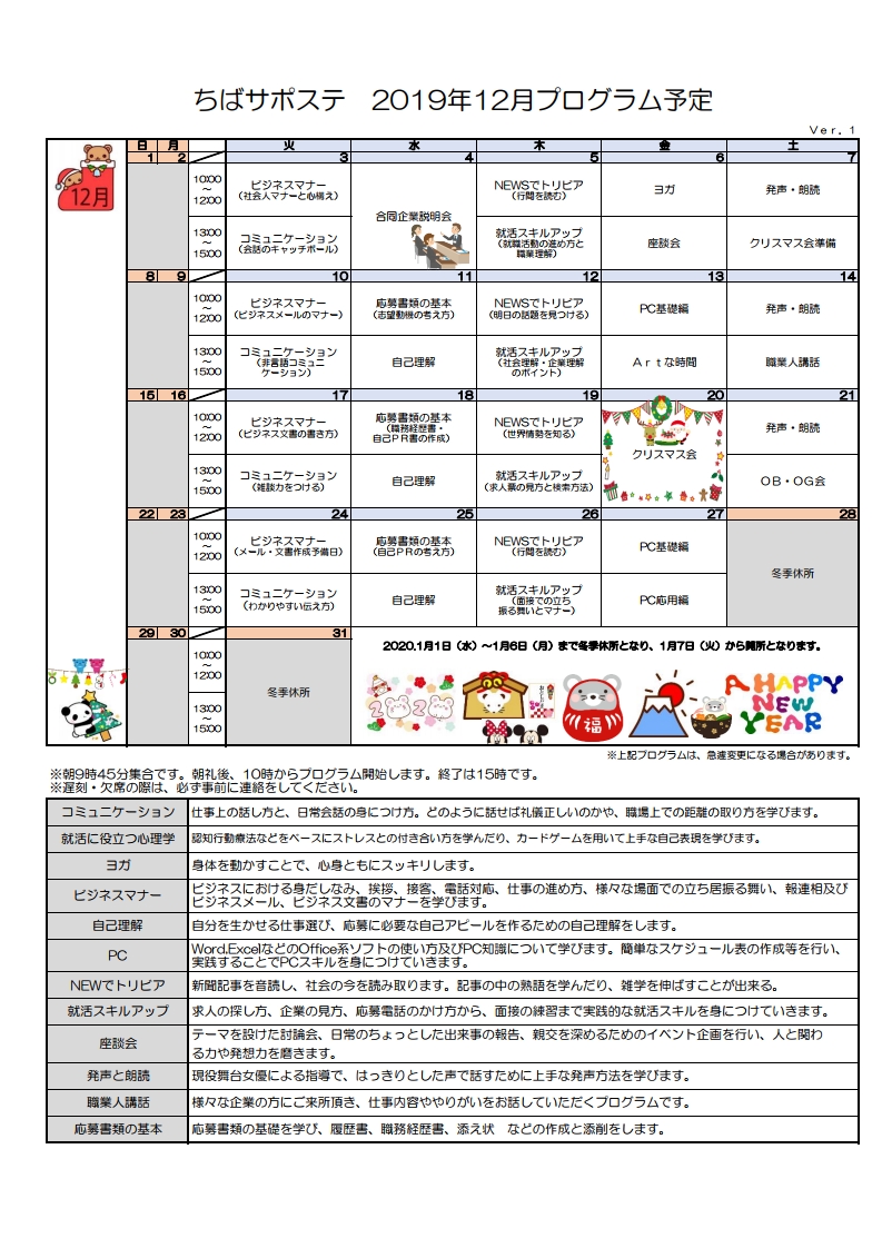 4月のプログラムの内容を記載しました! 新年度スタートは3日(金)からです。 午前中にちばサポステ利用についてのお話をしますので、今まで利用されていた皆さんは全員参加です(*^▽^*) 面談も3日(金)の午後からスタート […]