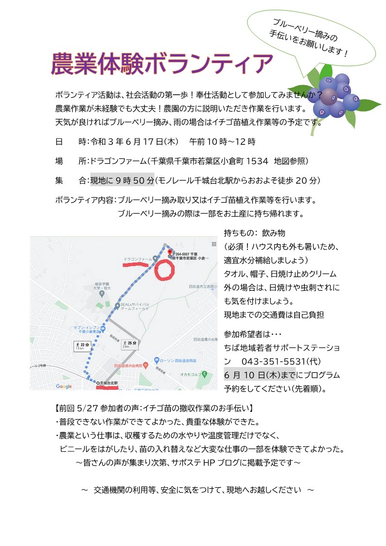 皆さん、こんにちは!! 6/17(木)午前のプログラムでは、農園さんでのボランティア体験を実施します(*^^*) 今回は、ブルーベリーの摘み取り作業とイチゴの苗植え作業になります。 前回、イチゴの摘み取りボランティアに参 […]