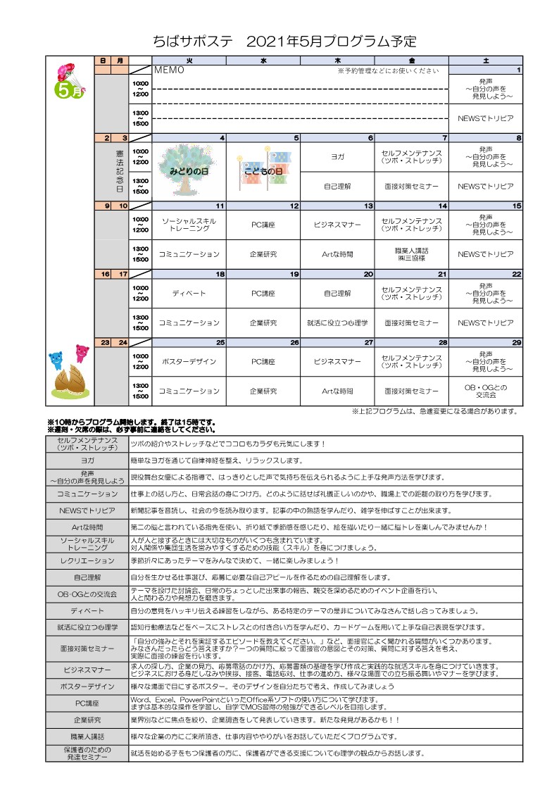 みなさん、こんにちは!ちばサポステです(^^)/ 新緑が眩しい気持ちよい季節が始まりましたね。 ちばサポステでは今年度も引き続き、 毎月1度四街道市総合福祉センターにて専門相談員による相談会を行っています! ご本人はもち […]