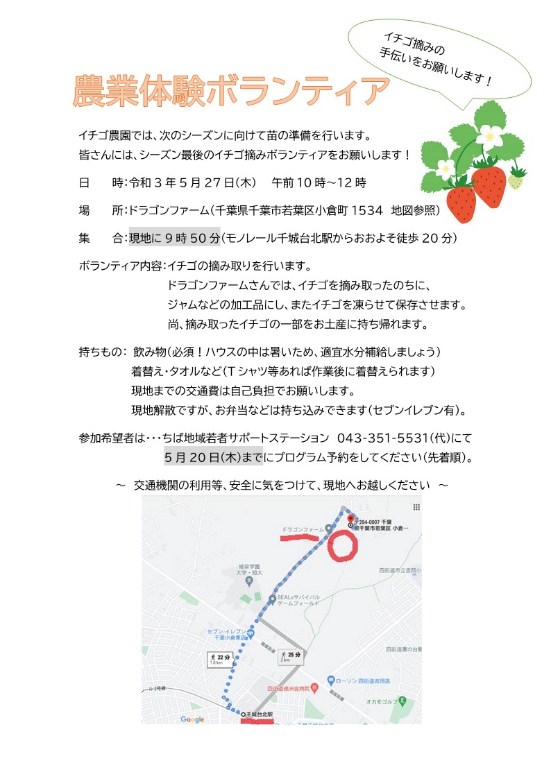 皆さん、こんにちは!! 5/27(木)午前のプログラムでは、イチゴ農園さんでのボランティア体験を実施します(*^^*) 皆さんには、シーズン最後のイチゴ摘みボランティアをお願いいたします。 なんと!イチゴのお土産付きのよ […]