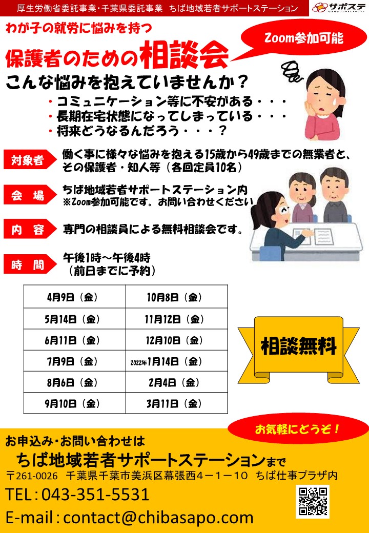 ちばサポステでは、毎月、ちばサポステ内(幕張)にて保護者のための相談会を開催しています。